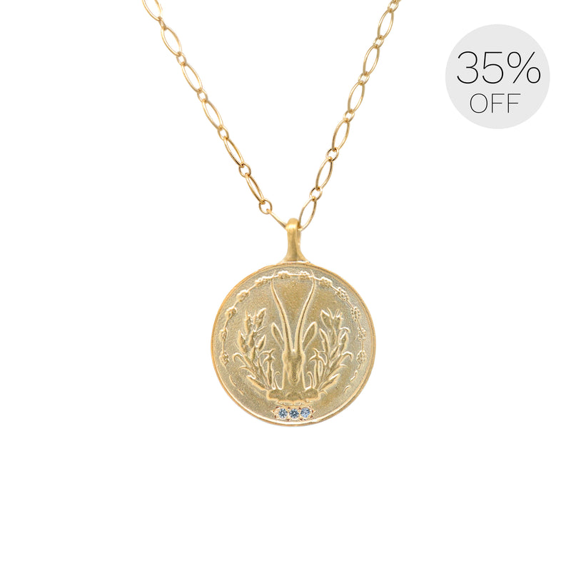 This incredible pendant was cast from an original West African Franc from 1959 featuring an antelope. The pendant has added hand detailing and three White Sapphire accents. It’s strung on an airy long and short cable chain that can be adjusted in length up to 21" making it a great option for layering with other pieces. Available in vermeil and rhodium-plated silver.